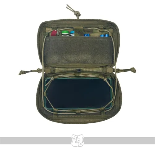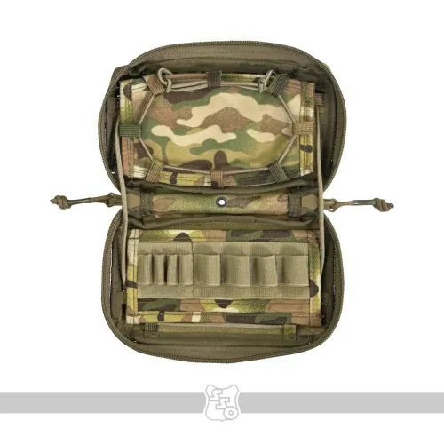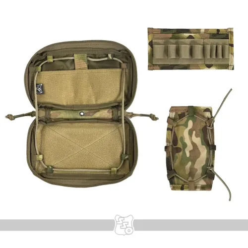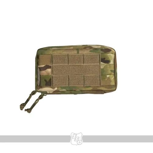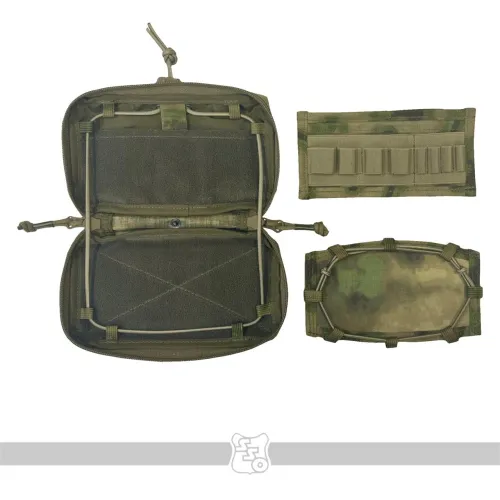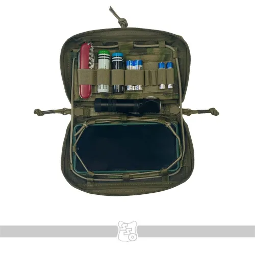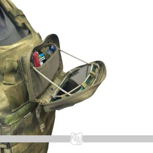 Административный подсумок " Вектор" был разработан нами с учетом пожеланий и опыта участников СВО. Была поставлена задача спроектировать подсумок в близком доступе для хранения и переноски мобильных средств связи , батареек или акб, пауербанка, небольшого инструмента, складного ножа или мультитула. Подсумок имеет размеры 20х11,5х4, крепление 3х4 ячейки молле. Основной зоной установки была выбрана панель над флэпом , которой обладает большинство чехлов на рынке. Подсумок устанавливается за счет двух вертикальных лент молле, что обеспечивает надежную фиксацию на плитнике. Основной объем представлен одним отделением с откидной стенкой, регулировка угла раскрытия которого происходит за счет шнура и утяжки. Пользователь может подстроить угол раскрытия под свои анатомические особенности, что позволит комфортно работать с содержимым без перекрытия угла обзора и наличия мертвых зон. В комплекте с сумкой идет два сменных модуля: • один рассчитан под установку мобильного телефона с фиксацией по окружности эластичным шнуром, что позволит отрегулировать панель под форм-фактор вашего устройства. Также встроенной пластиковой перегородной , которая призвана уберечь устройство от повреждения с внешней стороны. • второй для хранения пластиковых карт, небольшого формата документов или топографических карт, а также имеет слоты-резинки для установки АКБ формата 18650, CR123 , AA , AAA и им подобных. Ячейки разбиты на 4 больших и 4 малых. Панель крепится с помощью липучки к одной из внутренних стенок подсумка. При создании данного изделия мы предусмотрели вариант использования двух модулей с установленным оборудованием одновременно. В этом случае модуль для мобильных устройств крепится на стенку дальнюю от оператора , а модуль дополнительного снаряжения закрепляется в карман ближайший к оператору. Между двух модулей присутствует стенка из велкро полотна, которая предотвращает трение экрана мобильного устройства со вторым модулем, обеспечивая его сохранность от механического воздействия. Также мы снабдили карман хлястиком, для того чтобы улучшить обзор мобильного устройства и воспрепятствовать выпадению предметов из первого отсека. Модули расположенные внутри съемные, что позволяет не перебирая уже установленные аксессуары просто снять модуль и установить на актуальный комплект снаряжения. Внешняя стенка подсумка имеет вшитый пластиковый каркас, который служит дополнительной защитой от механического повреждения содержимого сумки. Для размещения патчей и опознавательных знаков на внешней стороне расположена велкро панель и молле ячейки для крепления дополнительно оборудования. Узел регулировки угла раскрытия подсумка сделан вынесенным для быстрого доступа и удобства регулировки. Длины шнура достаточно для его укладки за внешней стенкой подсумка и вывода стопора с его нижней части либо с верхней - кому как удобно. С учетом наличия большого количества источников потребления энергии, задействованных при работе оператора, наличие дополнительных средств питания стало обязательным для продолжительной работы вне зоны ПВД. Данный подсумок позволит организовать и защитить неотъемлемые элементы электроники и питания, так необходимые бойцам для выполнения поставленных задач. *Сумка поставляется без содержимого. Габариты: • Высот
