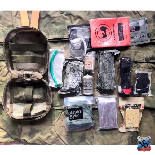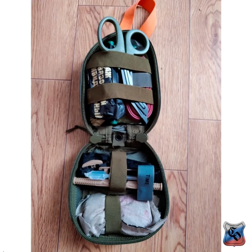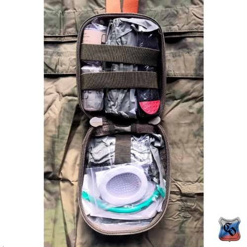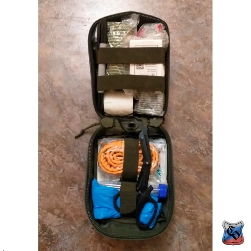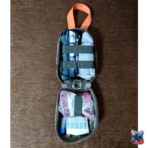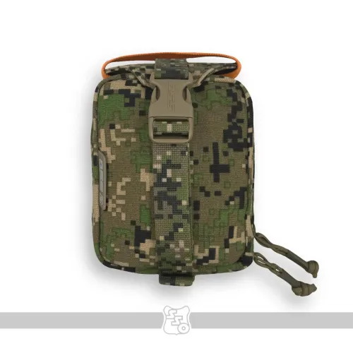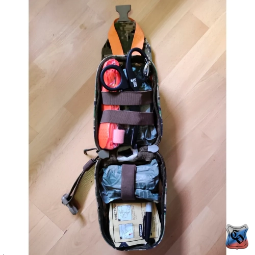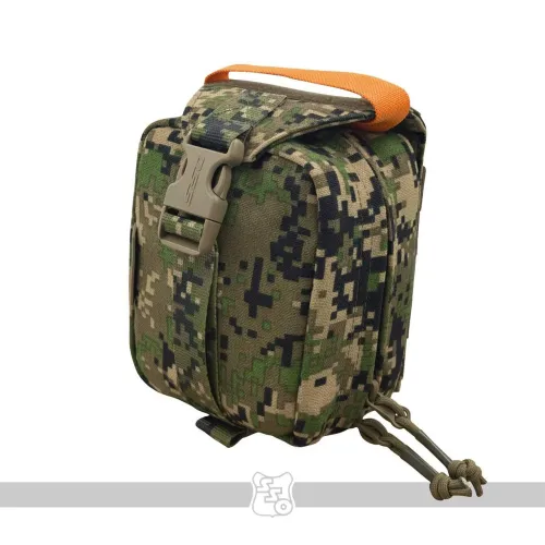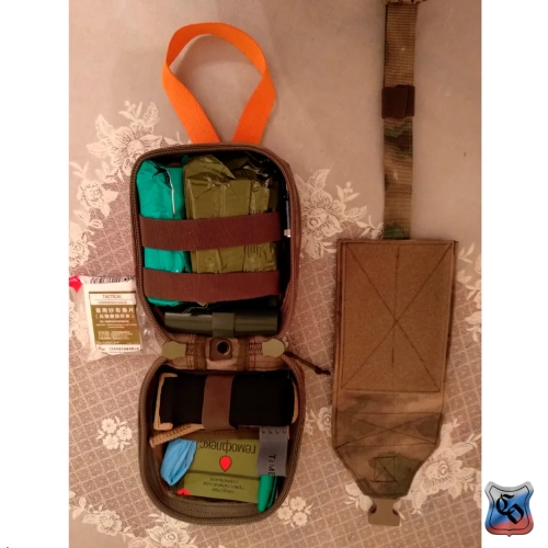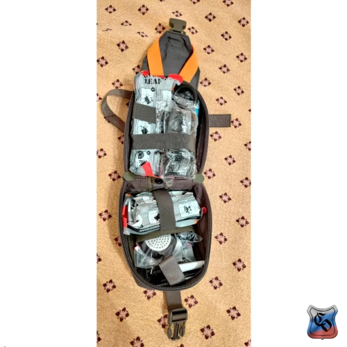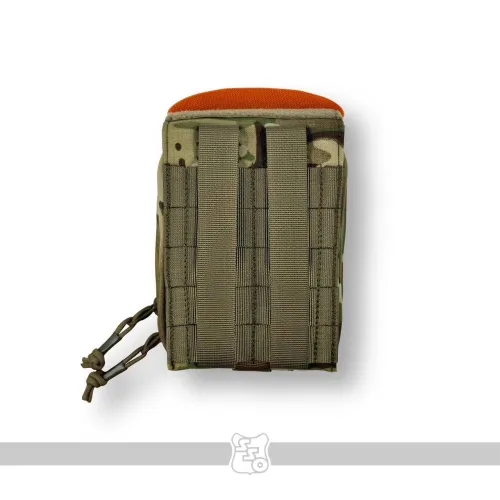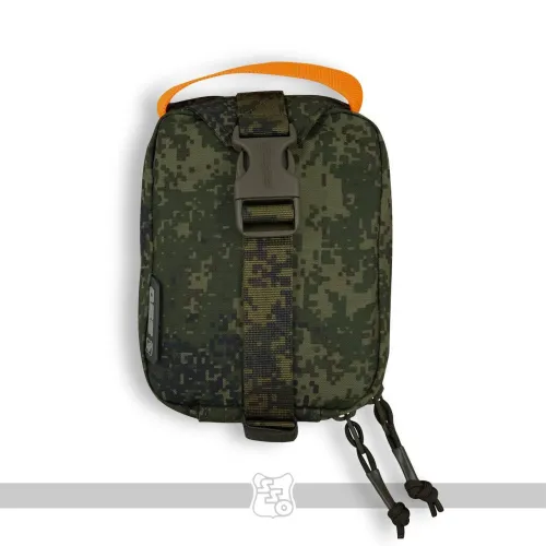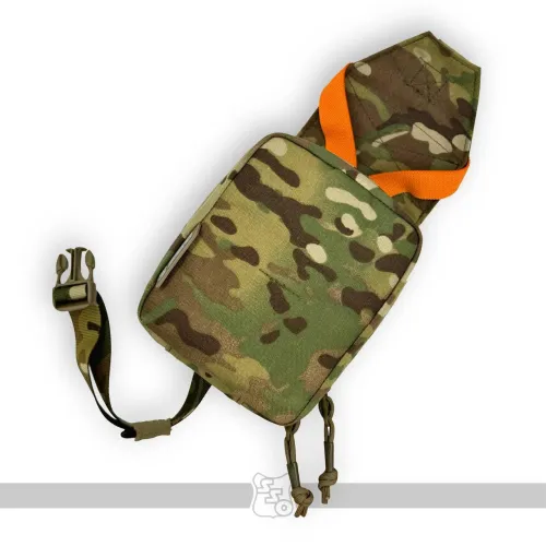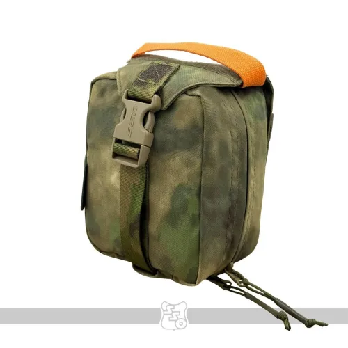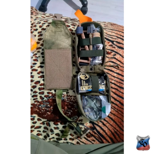 Аптечка отрывная КМП MOLLE Сумка для средств оказания первой доврачебной помощи при ранении лёгкой или средней тяжести, травмах, сильном кровотечении, для средств обработки ран, обезболивания. • Отрывная конструкция даёт возможность быстрого доступа к сумке одной рукой. Для этого достаточно расстегнуть фастекс и воспользоваться вытяжной петлёй большого размера. Квадратная форма аптечки даёт возможность расположить её на платформе молнией на бок, а не вверх, чтобы отсутствовала необходимость расстёгивания фастекса, что увеличит скорость доступа. Также отрывная конструкция позволяет боевому товарищу или медику получить доступ к содержимому аптечки без необходимости лишний раз кантовать раненого. • Сумка крепится к жёсткой платформе на липу большой площади (150 см2). • Для дополнительной страховки верху платформы находится клапан, который соединяет его с нижней частью с помощью ремня, застёгивающегося на фастекс. • Застёжки сумки на молнию с замками с длинными жёсткими подвесами позволяют быстрее её открывать, работать в перчатках, а также избегать лишнего шума от звона замков о саму молнию. • На обеих внутренних сторонах аптечки нашиты резинки для фиксации медикаментов. Дополнительно с одной из сторон под резинкой расположен карман, а с противоположной стороны в верхнем углу петля для крепления лейкопластыря. • Т.к. аптечка должна быть быстро найдена среди снаряжения раненого его товарищами – на внешней стороне клапана платформы есть велкро панель для размещения патчей. • На дне сумки люверс для отвода влаги. • На снаряжении сумка занимает 2 ячейки Molle. • При необходимости подсумок можно устанавливать не только на Molle основу, но и на ремни, сделав из строп петли нужного размера. • Аптечка поставляется без содержимого. Габариты: • Высота сумки – 15 см. • Длина сумки – 12 см. • Ширина сумки – 9 см. • Длина платформы – 11 см. • Высота платформы – 16 см. • Вес пустой сумки из материала плотностью 500D ~ 230 г.