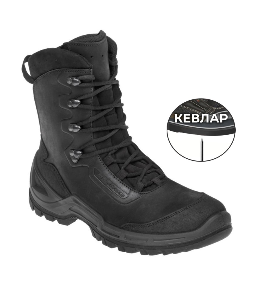 Тактические ботинки VAGABUND High Prabos. Особенности: * Подошва двойной плотности PHOBOS PU/Rubber – легкая, самоочищающаяся и устойчивая к истиранию. Разработана в сотрудничестве с компанией Vibram. * Кевларовая вставка в подошве защищает стопу от проколов. Легкая и гибкая, она не снижает комфорт при ношении. * Верх ботинок сделан из гидрофобной кожи. Благодаря этому обувь становится чрезвычайно комфортной. * Дышащая подкладка из PES+PA с высокой паропроницаемостью и стойкостью к истиранию. Отсутствие мембраны гарантирует высокую паропроницаемость даже при высоких температурах. * Стелька CLOUD — трехслойная амортизирующая стелька. Снижает усталость ног, поглощает неприятные запахи и улучшает отвод влаги. * Устойчивость к контактному теплу до 300 °C; * Сопротивление скольжению; * Антистатическая обувь; * Устойчивость к прокалыванию; * Абсорбция энергии в области пятки. Характеристики: Материал верха: Водонепроницаемая замша толщиной 2,0 - 2,2. Подкладка: Дышащий текстиль DRI-LEX® PES+PA, высокоустойчивый к истиранию. Подошва: Прямой впрыск PU/Rubber PHOBOS + кевларовая вставка. Стелька: CLOUD. Высота: 19 см.