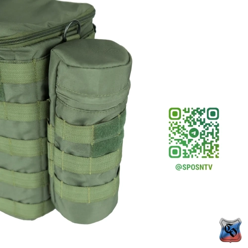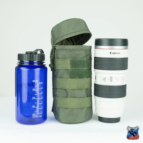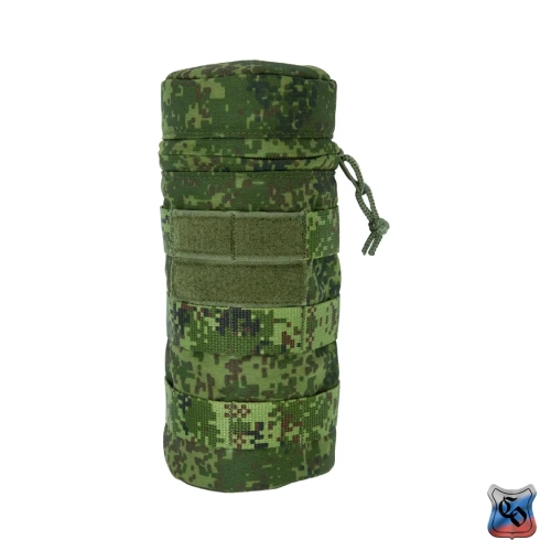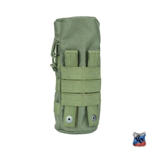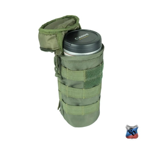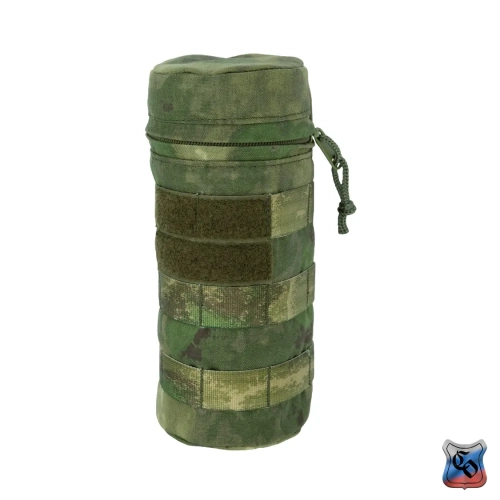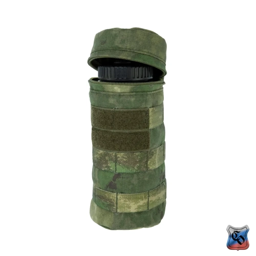 Чехол под бутылку универсальный MOLLE Чехол предназначен для ношения бутылки с водой объёмом 1 литр. Его особенностью является цилиндрическая форма, и прослойка из вспененного полимера, которая обеспечивает эффективную термоизоляцию и смягчает удары. • Основной отсек сумки закрывается на молнию с одним бегунком. На дне имеется металлический люверс для слива воды. • Сумку можно использовать как универсальный чехол, например, для объективов фотоаппаратуры. Размеры тубуса 230 мм в высоту и 95 мм в ширину, что соответствует по размерам большинству стандартных литровых бутылок, термосов или длиннофокусных объективов. • По всей поверхности чехла есть Molle стропы для крепления дополнительного снаряжения или установки дополнительных элементов снаряжения. • Часть строп покрыты липучкой для размещения патчей. • Для отвода влаги на дне сумки выполняется отверстие с металлическим люверсом. • На снаряжении подсумок крепится с помощью строп Molle, и занимает всего лишь 2 ячейки в ширину. При необходимости подсумок можно зафиксировать не только на Molle основу, но и на ремни, сделав из строп петли нужного размера.
