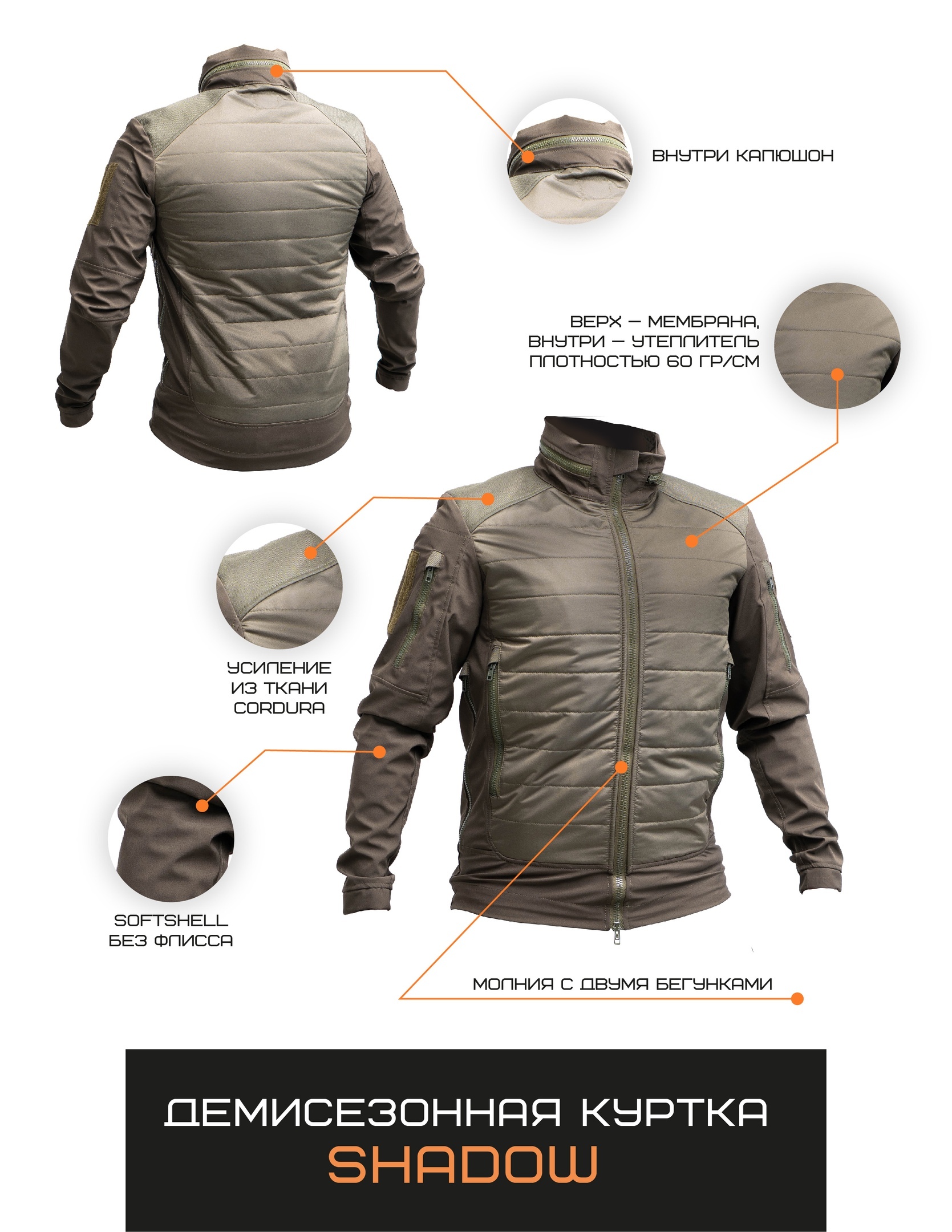 Легкая и практичная куртка Shadow разработана для комфортного использования в межсезонье. Оптимальный температурный диапазон — от 0 до +15°C. Куртка сочетает ветрозащиту, водоотталкивающие свойства и надежную теплозащиту. Материалы ● Рукава, низ куртки, воротник – изготовлены из Softshell без флиса, обеспечивая защиту от ветра и легких осадков. ● Спина и торс – выполнены из мембранного материала (3000 гр/м²/24 часа), который препятствует проникновению влаги и сохраняет дышащие свойства. ● Утеплитель в торсе и на спине – Alpolux 100 г/м², что делает куртку теплой для данной температуры. ● Плечи усилены тканью Cordura – дополнительная прочность и защита от истирания. Особенности Капюшон – убирается в воротник и фиксируется на молнии. Молния с двумя бегунками – удобная регулировка вентиляции. Велкро-панели на плечах – для крепления патчей и шевронов. Имеет 8 карманов ● 2 боковых на молнии – для быстрого доступа к мелочам. ● 2 кармана на плечах – удобно расположены в зоне велкро. ● 4 внутренних кармана – 2 закрытых на молнии и 2 открытых Доступные расцветки Олива, Черный, Мультикам, Мох, Койот, ЕМР, Светло-серый, Серый. Доступные размеры: 46-48, 48-50, 50-52, 52-54, 54-56, 56-58 Доступные ростовки: 166-172 см, 174-178 см, 182-188 см, 192-196 см Больше фото -