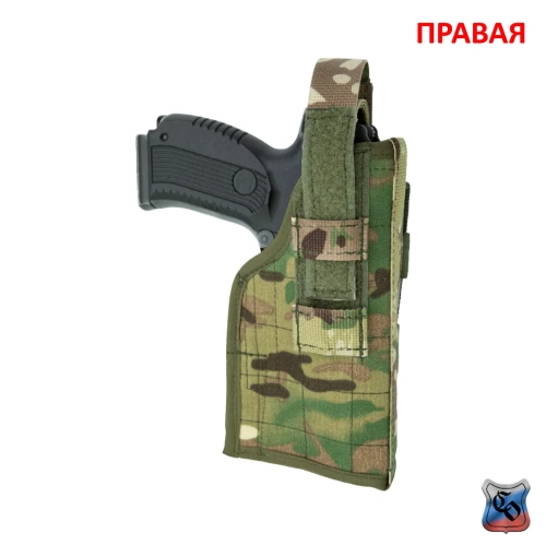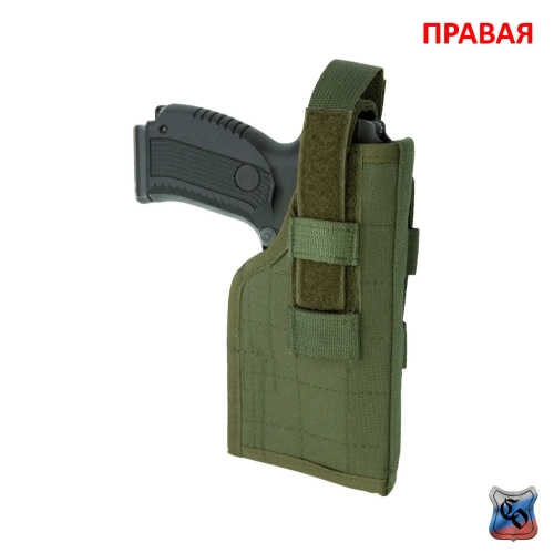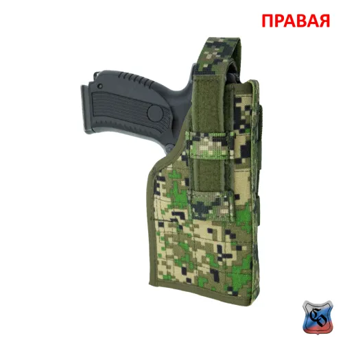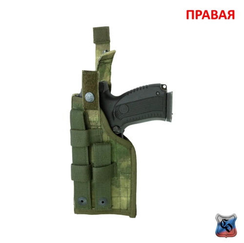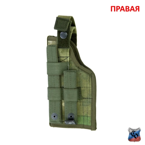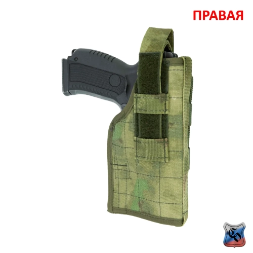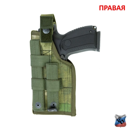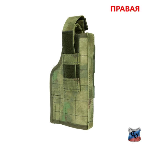 Кобура КП 1 ПЯ MOLLE без клапана • Фиксация пистолета в кобуре происходит с помощью системы ременных лет с застёжкой на кнопке. Со стороны крепления к снаряжению внутри ремня вшит пластик, чтобы ускорить поиск ответной части кнопки. Застёжка регулируется по высотке с помощью липучки. • Для дополнительной фиксации используется ременная лента на конце которой с обеих сторон нашита жёсткая липучка. Ответная часть липучки есть как со стороны крепления к снаряжению (доп. фиксация пистолета) и с внешней стороны кобуры (фиксация ременной ленты, чтобы не болталась и не мешала). • Кобура сшита из двух слоёв ткани с пенкой между ними. Укрепление ткани проходит методом простёгивания шва. • Со стороны затвора кобура усилена двумя слоями ременной ленты. • Кобура изготавливается отдельно под правую или левую руку. • Предназначена для ношения пистолетов АПС, Глок, ПЯ/Викинг и ПБ (6П9) в том числе с установленным глушителем. • На снаряжении сумка занимает 3 ячейки Molle. • При необходимости подсумок можно устанавливать не только на Molle основу, но и на ремни, сделав из строп петли нужного размера. • Вес пустой кобуры из ткани плотностью 500D ~ 120 г.