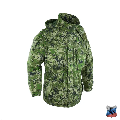 Ветрозащитная куртка со съёмным утеплителем "МДД-3" Верх ветрозащитной куртки и брюк из смесовой ткани полотняного плетения 220 гр (65 полиэфир / 35 хлопок) , с полиэфирной усилительной нитью (Рип – стоп), подкладка из лёгкой ткани полотняного плетения 100% полиэфир, со специальной пропиткой. Съёмный утеплитель куртки простёган полиэфирным, полым, термически соединённым волокном, плотностью 200 гр./ м., верхняя часть подкладки съёмных утеплителя из флиса (100% полиэфир). Волокна и флис минимально впитывают влагу и быстро сохнут – это обеспечивает хорошее удержание тепла. Утеплитель пристёгиваются к куртке пуговицами, и повторяет её конструкцию. Съемный утеплитель можно носить отдельно, как куртку или надевать под другую ветрозащитную или тёплую одежду. При этом борта застёгиваются на пуговицы, которыми утеплители пристёгиваются к ветрозащитным куртке. К подкладке съёмного утеплителя куртки притачивается специальный ветрозащитный фартук с резиновой стяжкой и шнуром в кулисе, фартук застёгивается впереди на две пуговицы и петли. Фартук не даёт проникать холодному воздуху и снегу под куртку. Низ рукавов съёмного утеплителя регулируется трикотажными, шерстяными манжетами. . Ветрозащитная куртка без воротника, с втачивающимся в горловину капюшоном из трёх частей, и девятью карманами для размещения необходимого имущества. Спинка и полочки куртки с пришитой юбкой и притачной внешней кулисой с продетым в неё шнуром с двумя пластиковыми стопорами. Низ куртки, также регулируется шнуром с двумя стопорами, продетым в кулису. Низ рукавов регулируется патами с текстильной застёжкой «Велкро» («липучка»). Капюшон куртки регулируется по объёму двумя шнурами продетыми в кулисы, со стопорами, и патой с текстильной застёжкой «Велкро» («липучка»). Для того, что – бы куртка не задиралась, при активных действиях, проймы рукавов очень широкие – 40 см. Карманы куртки размещены по следующей схеме: по два объёмных, накладных кармана, на груди и полах, на каждой полочке, с подворачивающимися клапанами – горловинами. Конструкция клапана, не даёт выпадать из кармана мелким предметам, например, при парашютных прыжках. Клапаны застёгиваются петлями на специальные пластиковые «канадские» пуговицы. Диаметр пуговиц 20,5 мм, они крепятся на тканевых ножках, (обычные пуговицы пришиваются ножками из ниток, продеваемых в четыре отверстия, а «канадские» пуговицы имеют две прямоугольные прорези, в которые продевается тесьма, притачивающаяся к ткани верха). По одному прорезному, вертикальному карману с листочкой, размещено на грудной части каждой полочки. Эти карманы застёгиваются на пластиковые застёжки «молнии», с шнурами на курсорах – для удобства работы в тёплых перчатках или рукавицах; на левом рукаве один накладной, объёмный карман с клапаном застёгивающимся на пуговицу с тканевой ножкой. На подкладке левой полочки, размещён один внутренний накладной карман, застёгивающийся на молнию. В нижней части подкладки спинки размещён специальный, большой карман без клапана, размером 70 на 30 см., для коврика – поддона.