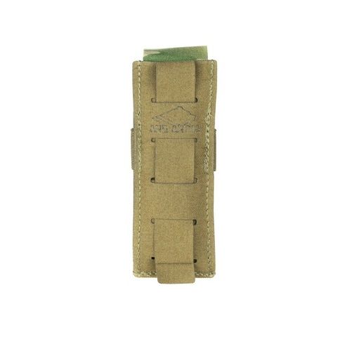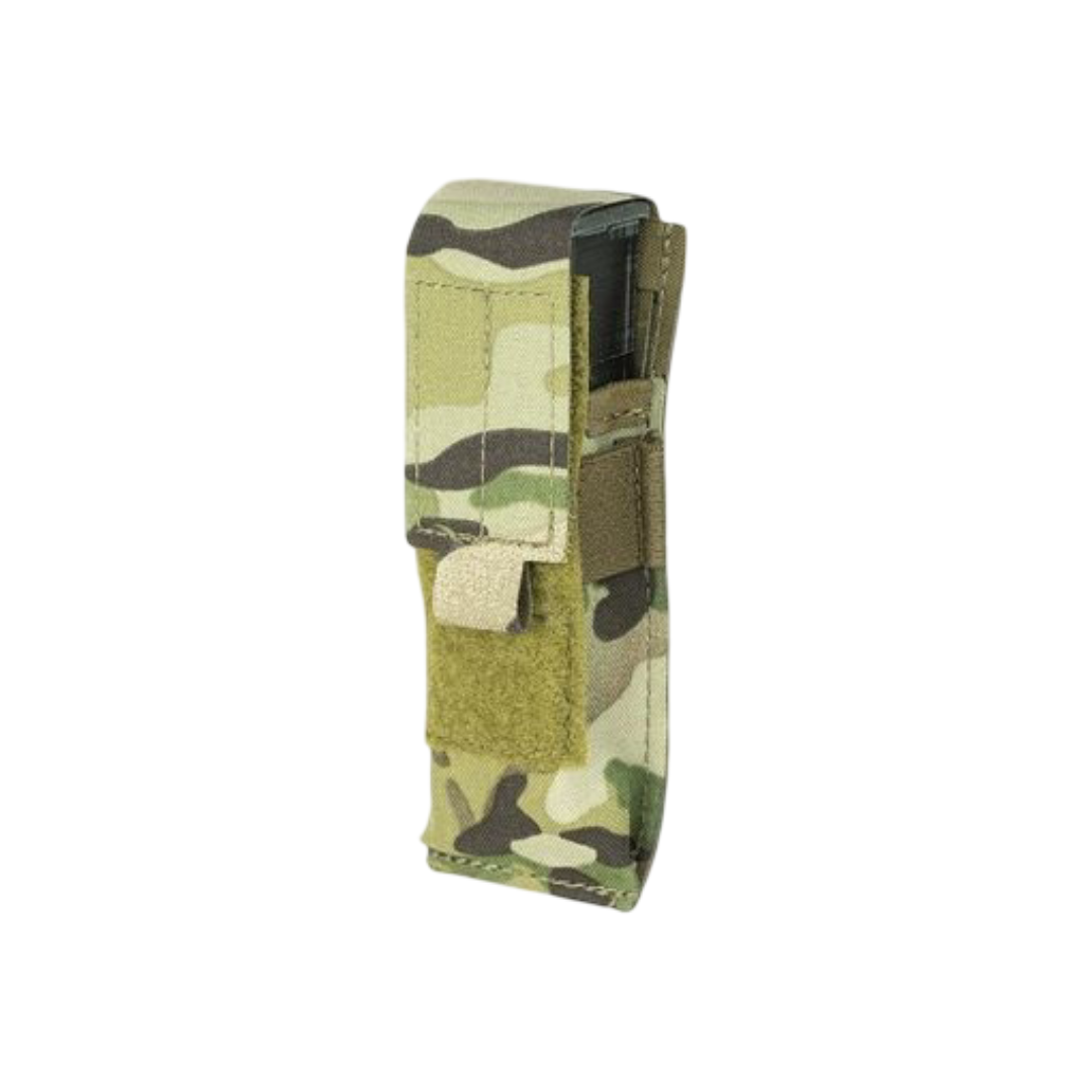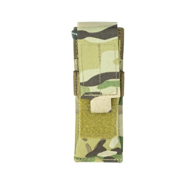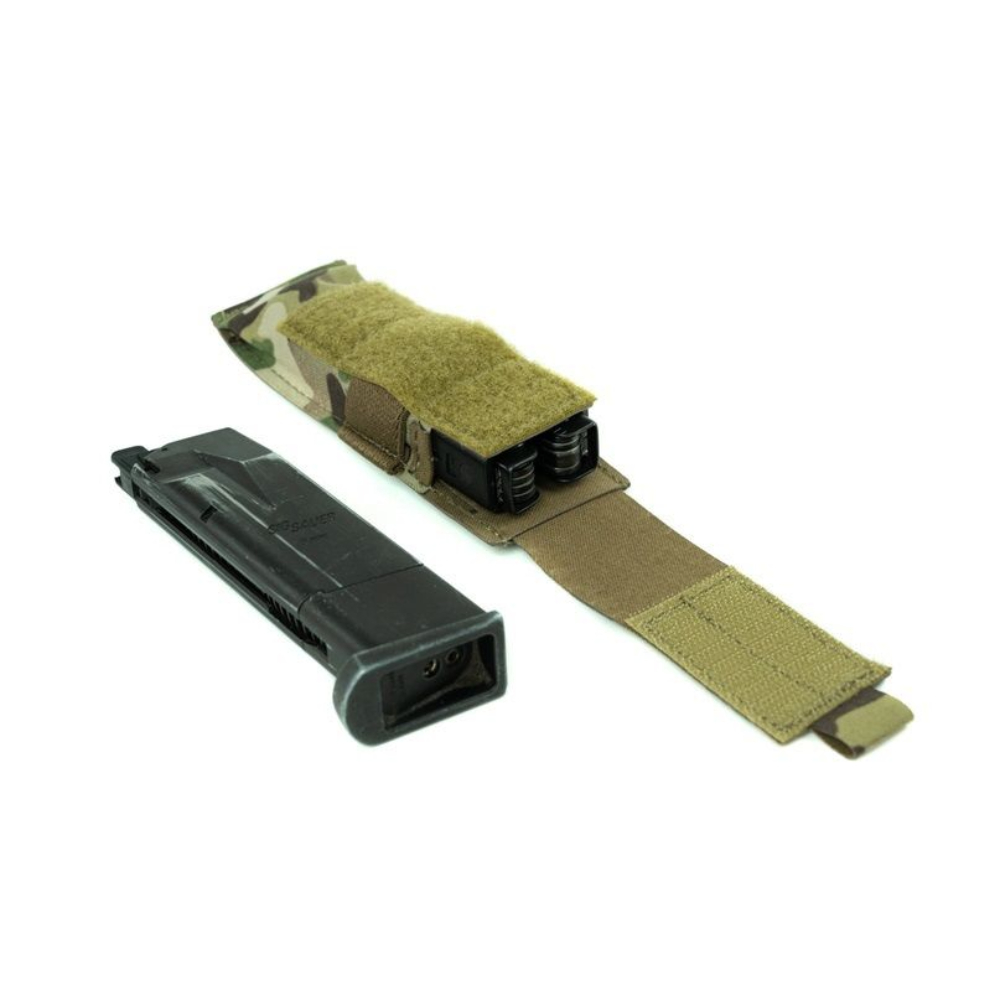 Фиксация содержимого осуществляется за счет регулируемого по высоте клапана с велкро, для лучшего удержания присутствует резинка, которая позволяет использовать подсумок с открытым клапаном для быстрого доступа к пистолетным магазинам.
