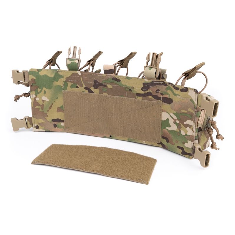На задней части жилета находится велкро панель на которую можно разместить магазинные подсумки или использовать для фиксирования нагрудника на велкро панели бронежилета.
