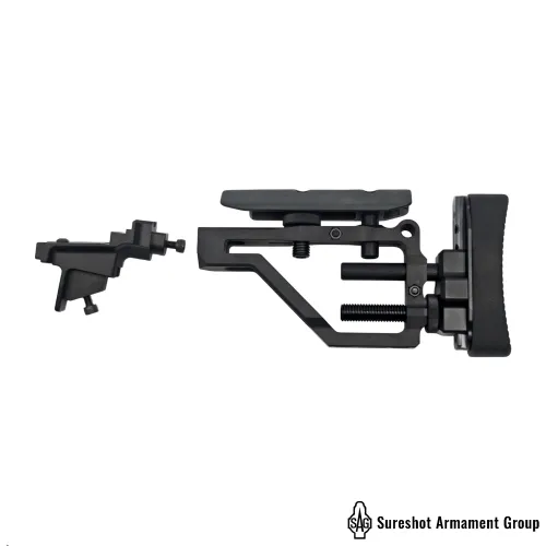 Регулируемый приклад SAG в комплекте с переходником СВД (S20036) SAG разработали полностью регулируемый приклад для винтовок СВД/Тигр/TG3 для всех владельцев, которые давно ждали подобного решения. До этого момента стрелки могли выбрать либо штатный приклад, либо варианты на буферных трубках по типу AR, оба варианта не устраивают многих как по функционалу, так и с эстетической точки зрения. Данный вариант полностью решает обе проблемы и даёт возможность получить потрясающий набор качеств без потери эстетики. • Приклад устанавливается в штатное место крепления приклада для СВД и позволяет в дальнейшем полностью подстраиваться под анатомию стрелка и условия стрельбы без использования инструментов. • Конструкция изготовлена путём фрезеровки из единого куска прочного авиационного сплава, все элементы крепежа работают по принципу сталь в сталь. • В качестве рукоятки используются решения от AR15 (в комплект не входят). • В варианте СВД переходник на приклад служит адаптером для AR пистолетной рукоятки (винт М6). • Совместимость: СВД, Тигр, Тигр-02, Тигр-308, TG-3. Диапазон регулировок: • Длина приклада (от спусковой скобы) – от 11,5” до -15.5” (от 29 до 39 см). • Высота щеки – от 0” до 2,2” (от 0 до 56 мм). • Высота затыльника – от -1.5” до 1.5” (от -38 до 38 мм). Вес: 649 г.