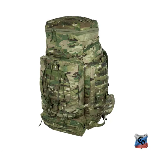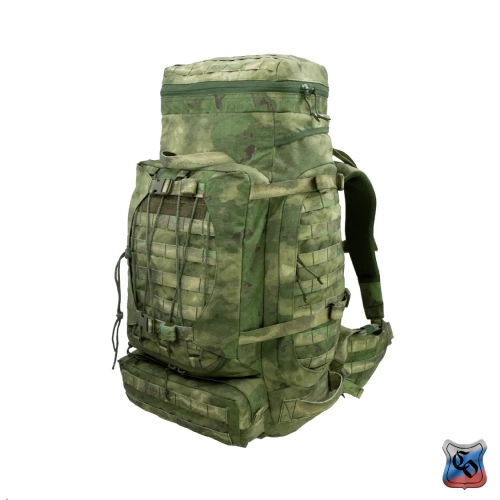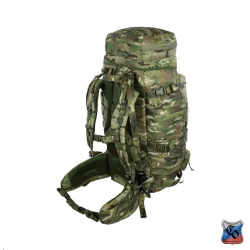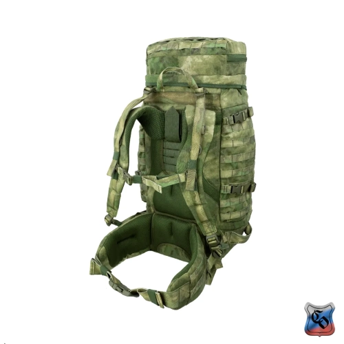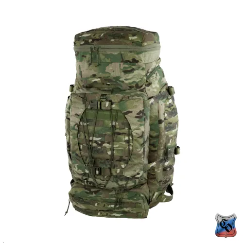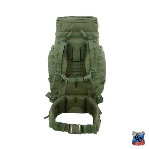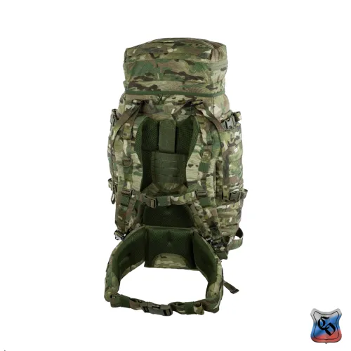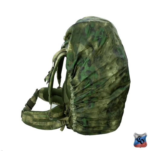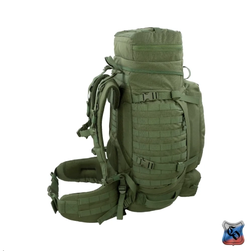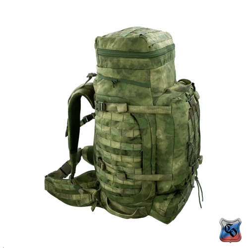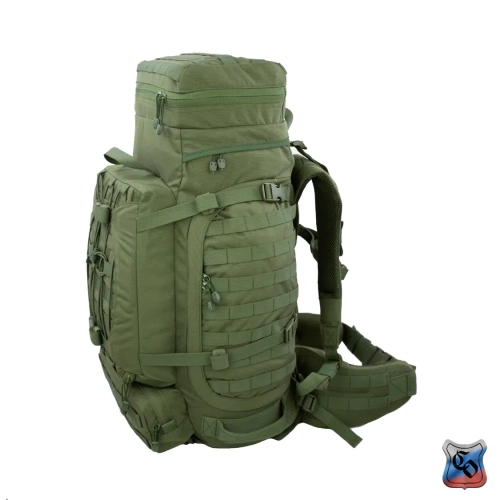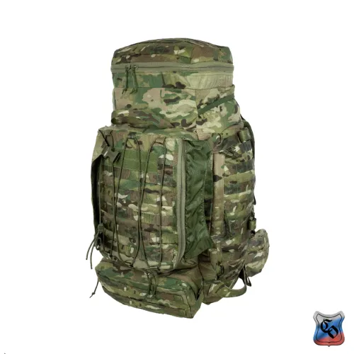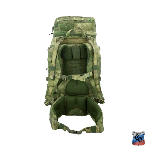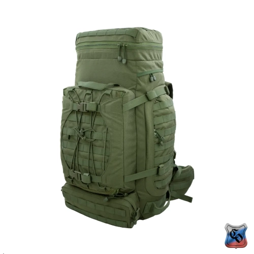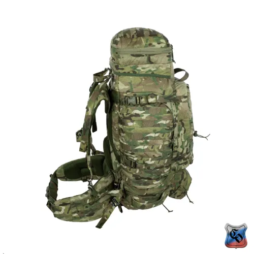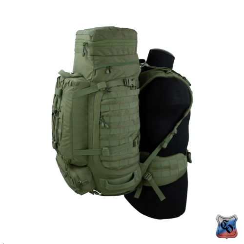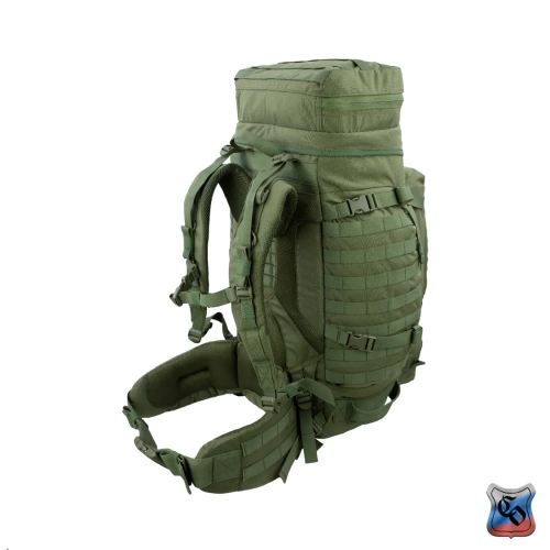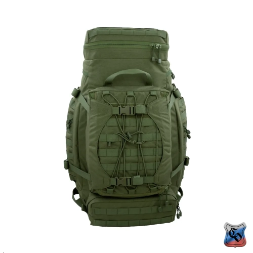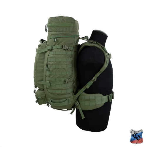 Рюкзак ВОИН Рюкзак для проведения разведывательно-поисковых действий в течение трёх суток. • Ёмкость рюкзака – 55 л. • Рюкзак состоит из семи отделений: основного, внутреннего из сетки, верхнего отделения быстрого доступа, боковых отделений, нижнего накладного кармана, нижнего отделения для чехла от дождя. • Главное преимущество рюкзака в доступе в основное отделение не только через верх, но и через П-образной вырез во внешней стенке, закрывающийся на молнию. Боковые карманы открываются в сторону и не выступают за габариты основной ёмкости. Такая конструкция обеспечивает быстрый доступ к содержимому (вещи не перемешиваются и быстро просушиваются). Узкий, вытянутый рюкзак удобен при движении в лесу и городе, улучшает маскировку. • Поверх внешней стенки есть крепления для шлема или коврика в виде съёмной эластичной шнуровки и двух стяжек, застёгивающихся на два фастекса. • Все отделения и верхний клапан закрываются прочными витыми молниями шириной 10 мм. Металлические подвесы замков заменены шнурами с наконечниками, чтобы не гремели. • Вещи, требующие максимально оперативного доступа укладываются в карман в верхнем клапане и в сетчатый карман под клапаном П-образного выреза. • Сетчатый карман также закрывает основную ёмкость на молнию. Открыв внешний клапан можно просушивать содержимое рюкзака на ходу. • Боковые карманы отделяются от основного отделения тонкой перегородкой с карманами и резинками для имущества. • Все внешние стенки рюкзака обшиты ременными лентами для крепления дополнительного снаряжения с Molle интерфейсом. • Рюкзак стягивается по бокам и внизу петлями из ременной ленты, застёгивающимися на замки и пряжки. • Излишки ремня убираются под эластичные муфты или липучки. • Система подвески рюкзака рассчитана на бойцов ростом от 160 до 190 см. • Регулируется как пряжками на концах плечевых S-образных лямок, так и перестановкой выше-ниже узла крепления на задней стенке. • Плечевые лямки и мягкие накладки задней стенки из объёмной толстой сетки. • Плечи и позвоночный столб разгружаются с помощью внутреннего каркаса и жёсткого пояса с мягкой подкладкой, застёгивающегося на замок-фастекс. Каркас состоит из пластиковой пластины толщиной 1 мм. Высота пластины – 59 см, ширина – 28 см. На пластину крест накрест нашиты ремни в которые вставлены два поликарбоновых прутка толщиной 8 мм. Прутки выступают наружу через отверстия внизу задней стенки, в районе боковых стяжек пояса. • Для удобного ношения рюкзака бойцом, носящим боеприпасы на бёдрах, пояс рюкзака снимается. Габариты рюкзака: • Высота основного отделения – 60 см. • Длина основного отделения – 30 см. • Ширина основного отделения – 22 см. • Вес пустого рюкзака из ткани плотностью 500D ~ 2.9 кг. • Вес каркаса ~ 0.4 кг.