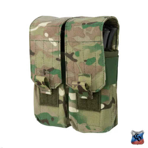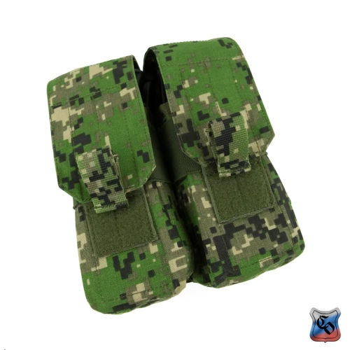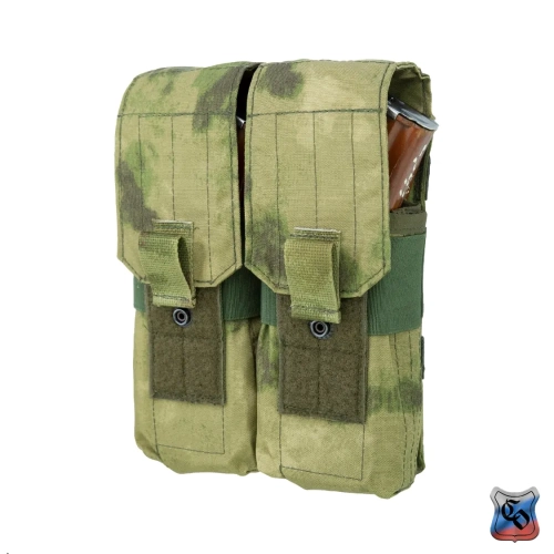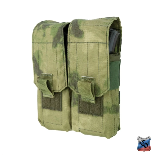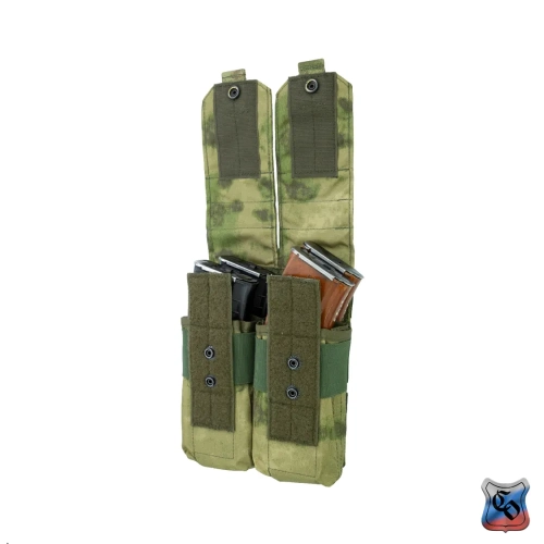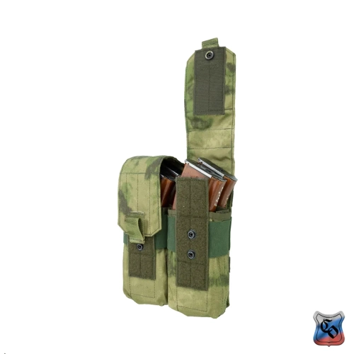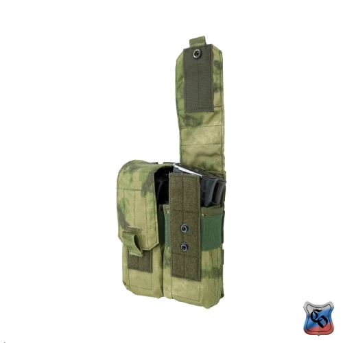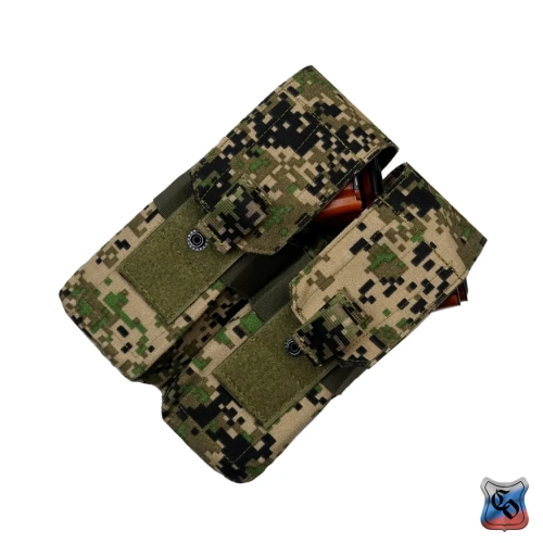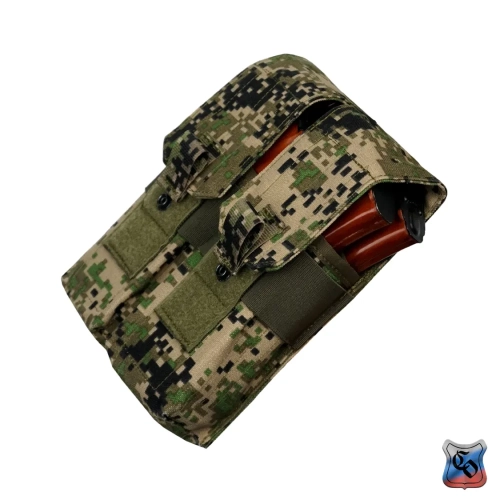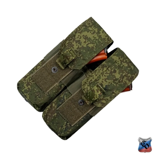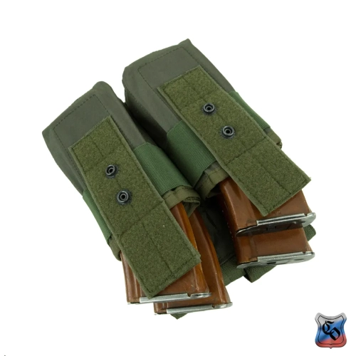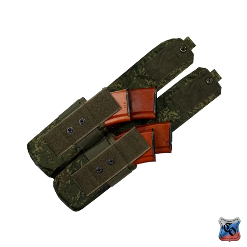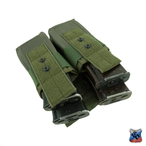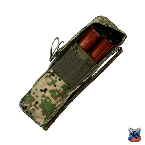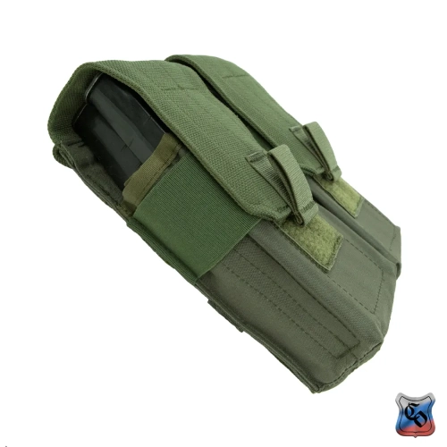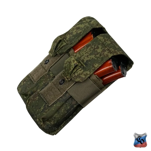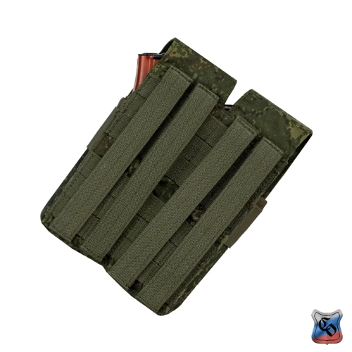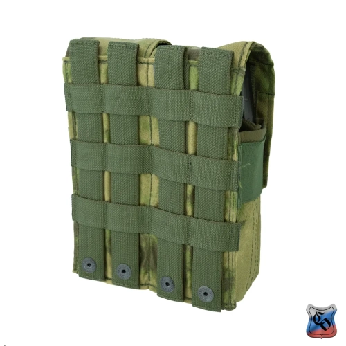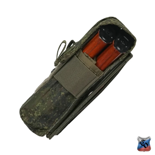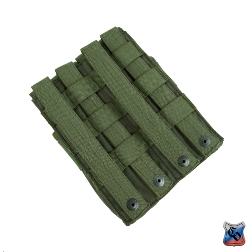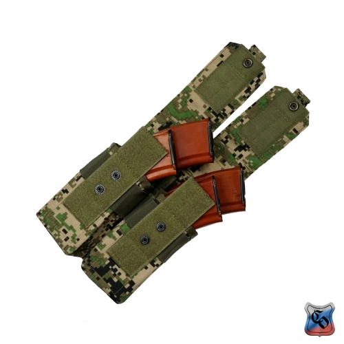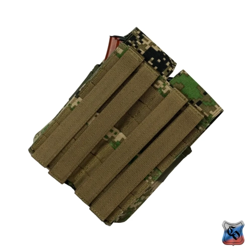 Сумка 4АК103 MOLLE с кнопками и липучкой • Сумка предназначена для размещения четырёх магазинов под патроны калибра 7,62 к автомату АКМ или 5,45 к автомату АК-74М. • Для того, чтобы увеличить срок службы подсумка и обеспечить быстрое извлечение магазинов, передняя стенка усилена пластиковой вставкой, по которой должен скользить передний зацеп магазина. • Каждый отсек сумки закрывается на прямоугольный клапан с универсальной застёжкой, которая состоит из липучки и кнопок. Одна кнопка расположена на самом клапане, две ответные части на внешней стенке сумки. Верхняя ответная часть предназначена для магазинов АК-103, нижняя для АК-74М. Жёсткая часть липучки, расположенная на клапане удлинённая и позволяет надёжно зафиксировать даже один магазин АК-74М. • Для более простого использования сумки в перчатках на клапане есть флажок, который развернут вверх. • Для более лучшей фиксации магазинов, верхняя часть каждого кармана стянута эластичной лентой, в сочетании с жёстким каркасом из пластика в передней стенке. Это обеспечивает надёжную фиксацию магазинов, даже когда клапан открыт. При необходимости вы вообще можете заправить клапан внутрь сумки, не боясь потерять магазины. • Магазины разделены съёмной перегородкой, плотно сидят и удобно достаются в перчатках. • Если того требует ситуация, можно снять перегородку и использовать сумку для переноски других схожих по габаритам предметов. • Клапан и дно сумки усилены вторым слоем ткани. • На дне есть отверстие с люверсом для слива воды. • На снаряжении сумка занимает 4 стандартные ячейки Molle. • При необходимости подсумок можно устанавливать не только на Molle основу, но и на ремни, сделав из строп петли нужного размера. Габариты: • Высота при фиксации на нижнюю кнопу – 21,5 см. • Высота при фиксации на верхнюю кнопу – 23,5 см. • Длина – 17 см. • Ширина – 7 см. • Вес пустого подсумка из ткани плотностью 500D ~ 305 г.