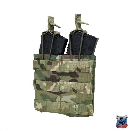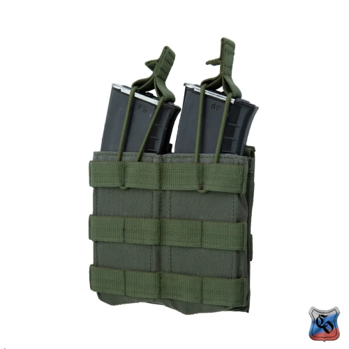 Сумка АКМ 2 MOLLE без клапана • Сумка предназначена для размещения двух магазинов от АК и максимально быстрого доступа к ним. В каждый из двух отсеков сумки помещается магазин под патрон в калибре 7,62 к автомату АКМ или 5,45 от АК-74М. Также возможно размещение магазинов для штурмовых винтовок на AR платформе. • Фиксация магазина происходит с помощью эластичного шнура с флажком, которым удобно пользоваться даже в перчатках. • Для того чтобы сумка лучше держала форму и ей было удобнее пользоваться в переднюю стенку вшит лист пластика толщиной 1 мм. • Для размещения на сумке дополнительного снаряжения или других сумок, на передней стороне нашиты три ременные ленты с 4 ячейками Molle на каждой. • На дне расположено отверстие с люверсом для слива воды. • На снаряжении сумка занимает 4 стандартные ячейки Molle. • При необходимости сумку можно устанавливать не только на Molle основу, но и на ремни, сделав из строп петли нужного размера. Габариты: • Высота (без флажков) – 15 см. • Ширина – 16 см. • Глубина – 3 см. • Вес пустого подсумка из ткани плотностью 500D ~ 170 г. • Вес пустого подсумка из ткани плотностью 1000D ~ 165 г.