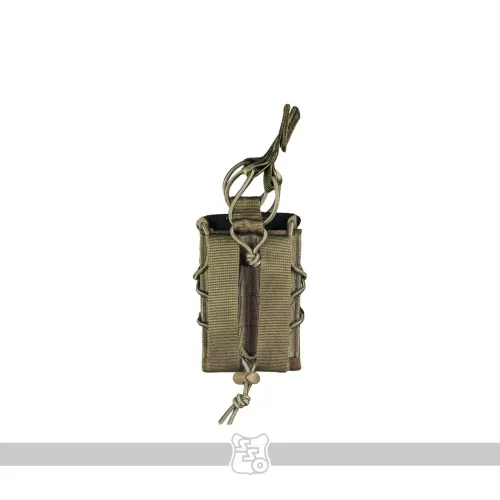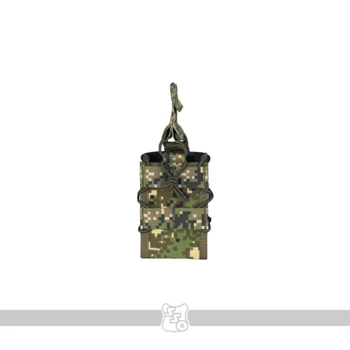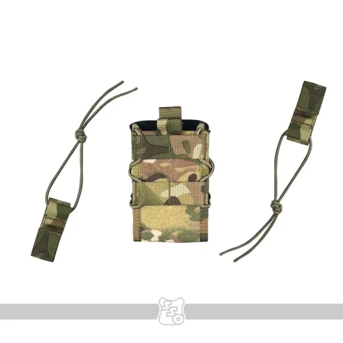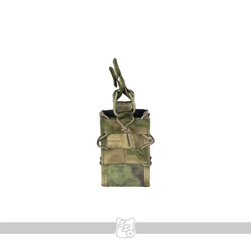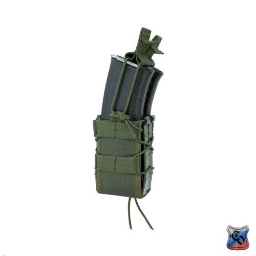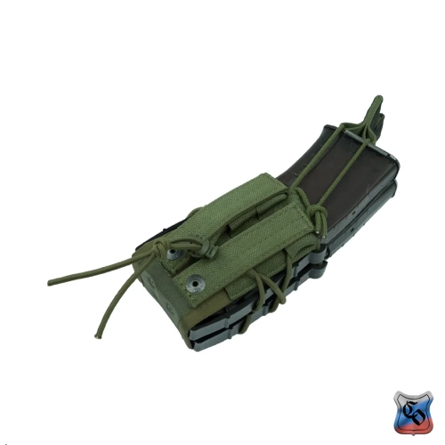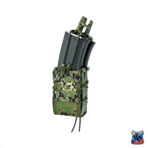Сумка АКМ 2 RAID MOLLE без клапана и с утяжкой • Сумка предназначена для размещения двух магазинов на 30 патронов любого типа для автоматов АК, винтовок AR-15 и других автоматов с магазинами схожих габаритов. • Особенность сумки заключается в использовании П образного пластикового каркаса, который надёжно удерживает магазин без дополнительного накидного эластичного шнура. В тоже время каркас обеспечивает самый быстрый и бесшумный доступ к извлечению и укладке магазина обратно в сумку. • Чтобы магазины не цеплялись друг за друга, отсеки под автоматные магазины разделены пластиковой перегородкой. • Плотность удержания магазина в сумке регулируется с помощью эластичного шнура, который крепится за Molle ячейки передней и задней стенки сумки и обхватывает П-образный каркас. Благодаря такой конструкции можно отрегулировать оптимальную степень фиксации под каждую конкретную модель магазина. • Для предания каркасу большей прочности на внешней стороне выполнены горизонтальные рёбра жёсткости. • На случай, если специфика применения требует дополнительную фиксацию магазина, например при высотных работах или десантировании с парашютом, в комплекте есть эластичные шнуры с флажками, которые можно установить на сумку, продев их в специальные петли. • Для размещения на сумке дополнительного снаряжения или других сумок на передней стороне нашиты ячейки Molle. • На снаряжении сумка занимает 2 стандартные ячейки Molle. • При необходимости подсумок можно устанавливать не только на Molle основу, но и на ремни, сделав из строп петли нужного размера. Габариты: • Высота – 12,5 см. • Длина – 8 см. • Ширина 5 см. • Вес сумки из материала плотностью 500D ~ 140 г.