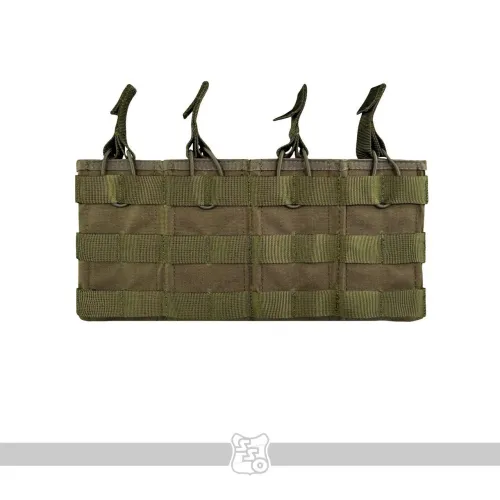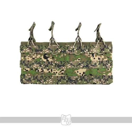 Сумка АКМ 4 MOLLE без клапана • Сумка предназначена для размещения четырёх магазинов от АК и максимально быстрого доступа к ним. В каждый из четырёх отсеков сумки помещается магазин под патрон в калибре 7,62 к автомату АКМ или 5,45 от АК-74М. Также возможно размещение магазинов для штурмовых винтовок на AR платформе. • Фиксация магазина происходит с помощью эластичного шнура с флажком, которым удобно пользоваться даже в перчатках. • Для того чтобы сумка лучше держала форму и ей было удобнее пользоваться в переднюю стенку вшит лист пластика толщиной 1 мм. • Для размещения на сумке дополнительного снаряжения или других сумок, на передней стороне нашиты три ременные ленты с 8 ячейками Molle на каждой. • На дне расположено отверстие с люверсом для слива воды. • На снаряжении сумка занимает 8 стандартных ячейки Molle. • При необходимости сумку можно устанавливать не только на Molle основу, но и на ремни, сделав из строп петли нужного размера. Габариты: • Высота (без флажков) – 15 см. • Ширина – 30 см. • Глубина – 3 см. • Вес пустого подсумка из ткани плотностью 500D ~ 290 г. • Вес пустого подсумка из ткани плотностью 1000D ~ 305 г.