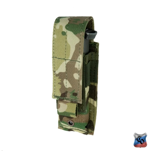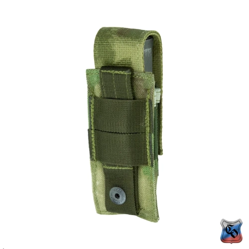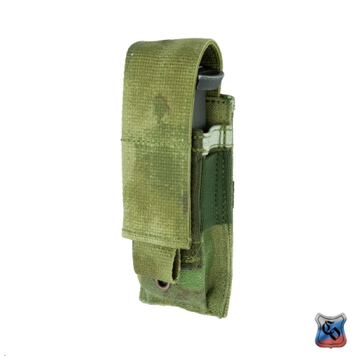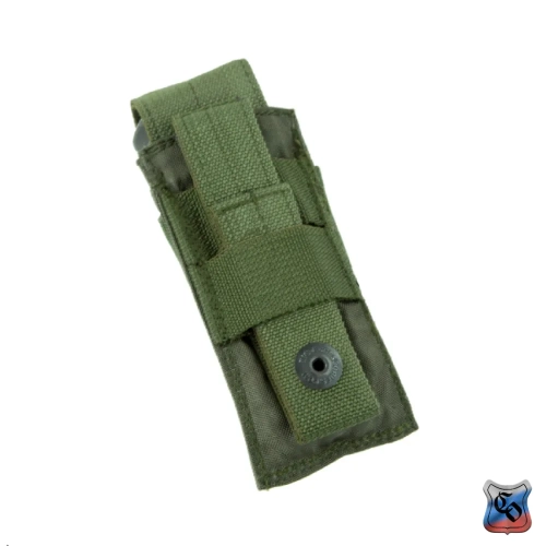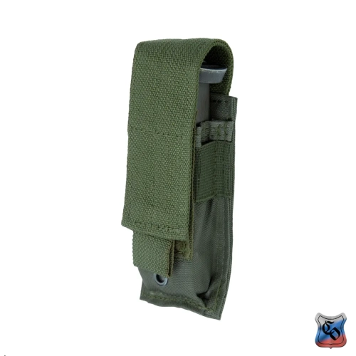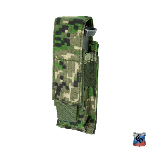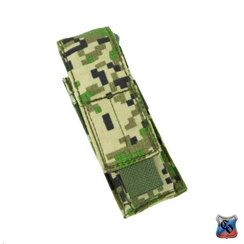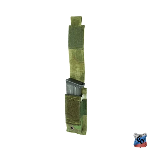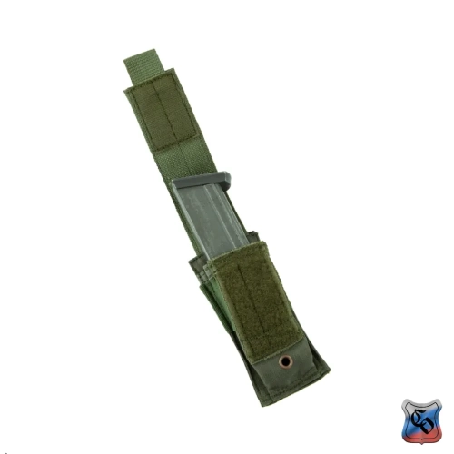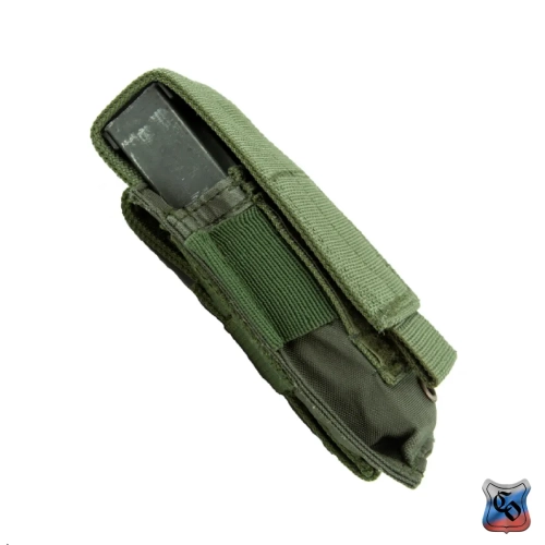 Подсумок под один магазин пистолетов ПЯ, Глок и аналогичных. Внутренние размеры могут немного меняться за счёт регулировки при застёгивании замка-липучки у верхнего клапана. Подсумок дополнительно оснащён прорезиненной тесьмой, предохраняющей магазин от выпадания при открытом клапане. Внешние размеры: 145х50х35 мм. Внутренние размеры: 140х40х25 мм (клапан застёгнут в крайнем нижнем положении). Вес: 50 г.