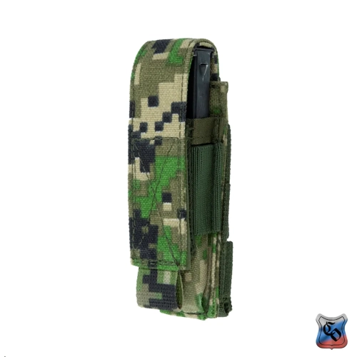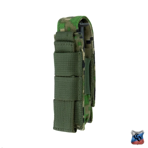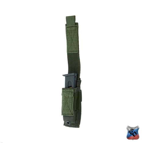 ПОБ-1 ПМ MOLLE Подсумок для одного магазина к пистолету ПМ. Подсумок крепится как на различных образцах платформ, жилетов, поясов с креплением РАLS (MOLLE), так и на обычных поясных ремнях. Надёжную фиксацию магазина обеспечивает эластичная утяжка кармана подсумка и клапан из двух слоёв ременной ленты с застёжкой на «липучку» площадью 18 см². Для удобства открывания клапана в перчатках, снизу к нему пришивается «флажок» к которому можно привязать дополнительную петлю из шнура. Утяжка и подвёрнутый внутрь клапан обеспечивают быстрый доступ к открытому магазину без угрозы его потери. Крепление подсумка к платформам, отличается от классического РАLS (MOLLE) тем, что вертикальный жесткий ремень не пристёгивается кнопкой к задней стенке, а сделан на 50 мм длиннее подсумка и подворачивается под горизонтальные ременные ленты. Три ленты на подсумке пришиваются подряд вплотную, что позволяет закрепить подсумок даже на узком брючном ремне. Габариты подсумка: Высота – 120 мм; ширина – 15 мм; длина – 40 мм. Вес пустого подсумка 40 грамм.