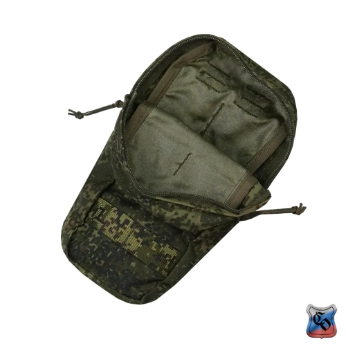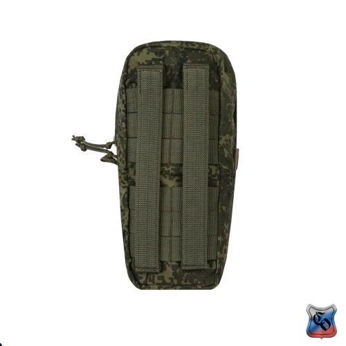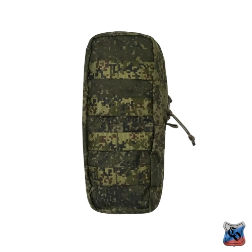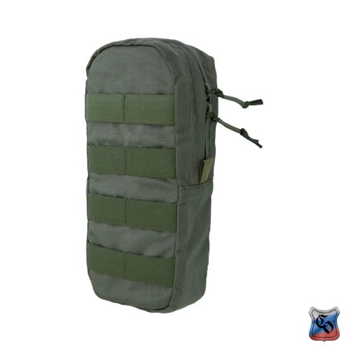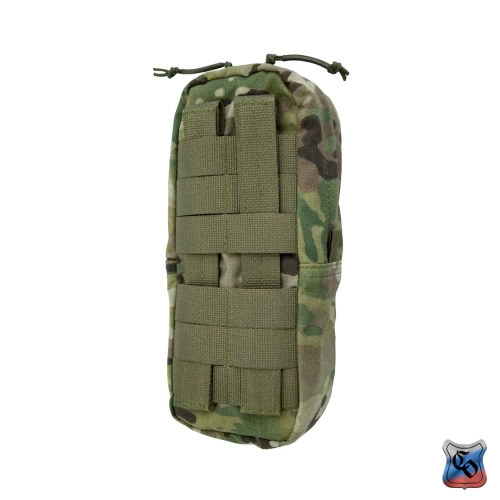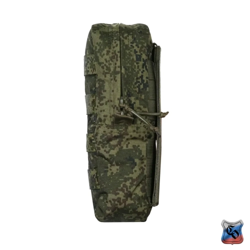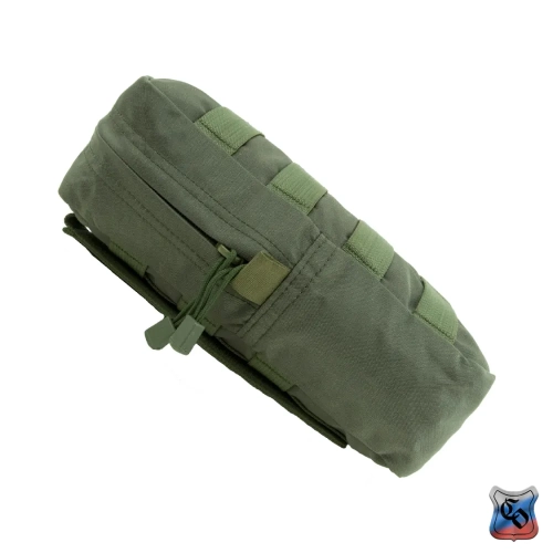 Основная особенность этой сумки, её вертикальное размещение, благодаря чему она имеет достаточно большой объём, но при этом занимает всего 2 ячейки molle на снаряжении. Застёгивается на молнию с 2 бегунками. Молния начинается от середины сумки, благодаря чему есть доступ к предметам, которые находятся даже на дне. Для отвода влаги на дне сумки выполняется отверстие с металлическим люверсом. На снаряжении крепится с помощью строп molle, и занимает всего лишь 2 ячейки в ширину. Для экономии места на снаряжении, сумка обшита molle стропами, на которые можно пристёгивать дополнительные модули. Утилитарку можно использовать для размещения различных предметов, например бутылки с водой и пакетов с едой с химическим нагревателем, горелки формата JET BOIL, баллона с газом, защищенных ночных приборов и даже нескольких ручных гранат. Высота – 250 мм; Длина – 100 мм; Ширина – 70 мм; Вес пустой сумки из материала плотностью 500D – 130 грамм.