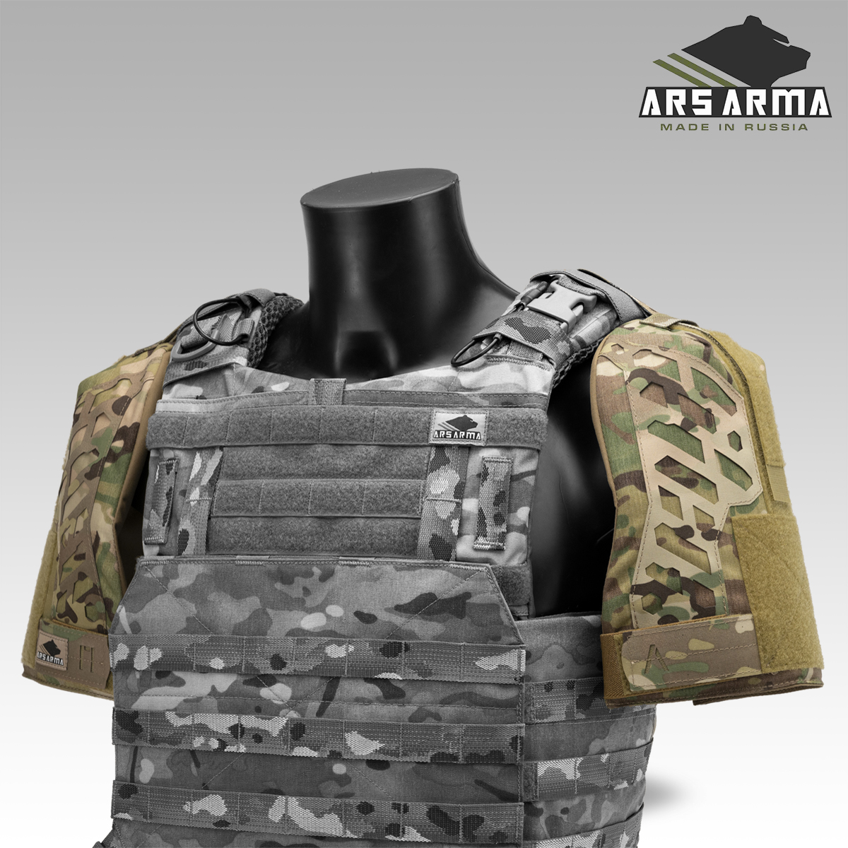 Новое поколение баллистической защиты Новая модель баллистической защиты плеч А-23 Айлет обеспечивает высокую площадь защиты от осколков и пистолетных пуль. В задней проекции можно отметить увеличенный профиль, который учитывает анатомические особенности строения тела и позволяет получить дополнительную защиту без ущерба для удобства использования. В плечи установлен имитация балистического пакета Новый уровень эргономики позволяет получить защиту без потери мобильности и удобства работы с оружием. Легкая регулировка по высоте за счет хлястика на липучке позволит вам быстро настроить плечи по вашей фигуре даже не снимая жилет с себя. Эластичные стропы обхвата бицепса дают комфорт и адаптацию под разную одежду и положение рук, которые также можно настроить не снимая жилет. Ламинированные элементы снаружи защиты плеч придают фактуру, которая помогает разбить силуэт и одновременно с этим могут служить для закрепления элементов маскировки, например, 3Д сетки. Велкро на внешней стороне можно использовать для размещения ведомственных и других патчей. Современный и эргономичный дизайн модуля защиты подчеркивает нашу приверженность технологичности и материалам высокого уровня. Возможности установить баллистику без разбора изделия нет, наполнение зашивается на этапе производства. ● Cordura 500D ● Ламинат 500/500 ● Увеличенная площадь защиты ● Высокий уровень эргономики ● Интерфейс для установки элементов маскировки ● Удобство установки и регулировки ● Надежность конструкции ● Велкро для патчей на плечах