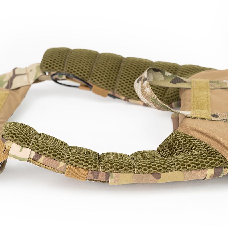 Лямки хорошо вентилируются за счет крупноячеистой сетки и правильно переносят вес жилета на плечи благодаря своей форме.